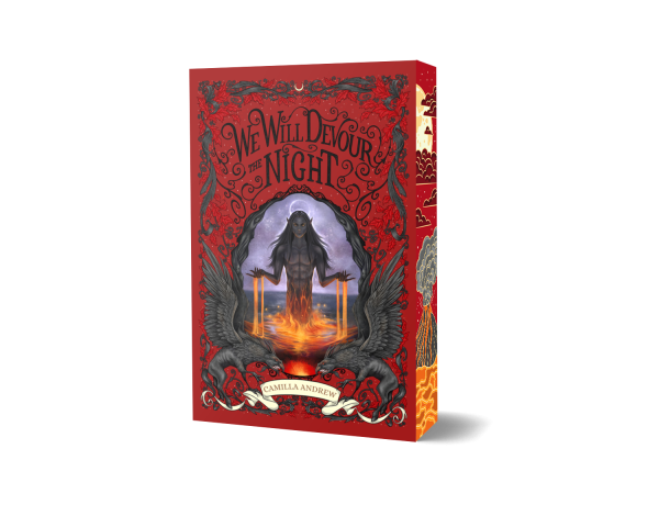 Paperback of WE WILL DEVOUR THE NIGHT with cover art and interior illustrations by Eeva Nikunen & Megan Wyreweden. Sprayed edge is designed by Chloe Hughes.